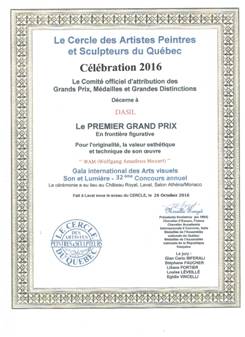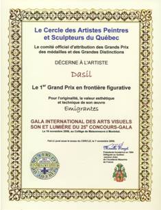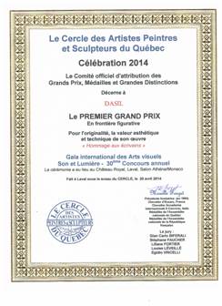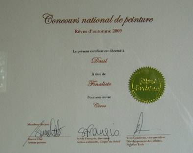 ------- 1er Grand Prix en frontière figurative ------- Concours national de peinture Le Festival Rêves d’automne a décerné à Jury: Bruno Côte - artiste peintre,