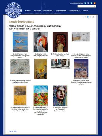 26e exposition Concours- Gala International, ------- Rêves d’automne- La promenade des grands peintres. Concours National de Peinture- Rêves d’automne La Ville de Baie-Saint-Paul soulignait le 25àme anniversaire du Cirque du Soleil, ce colosse qui, avec les échassiers de son fondateur Guy Laliberté, y a fait ses humbles débuts à la fête foraine annuelle des années 80. Pour cette occasion spéciale, le Festival Rêve d’Automne dans son concours national de peinture avait créé la catégorie « Cirque » dont ------- Galerie Espacio México, Équipe MEXI-QUE-BEC ------- Le Club des Arts-Galerie Arte Bella ------- Le Cercle des Artistes Peintres et Sculpteures du Québec, ------- Petits formats. Le Club des Arts, Centre Leonardo Da Vinci ------- ------- Exposition thématique sur invitation ------- Galerie Espacio México, Artistes de Montréal ------- 6a Biennale Internazionale dell’ Arte Contemporanea